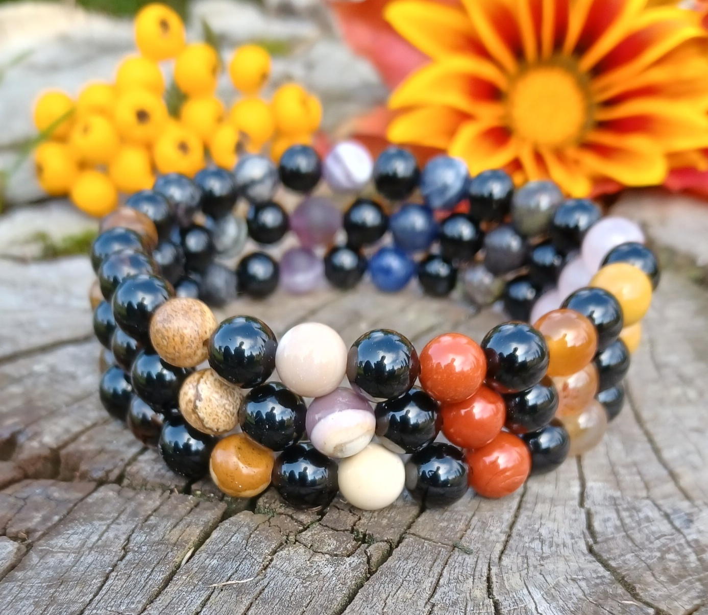 Náramek z kuliček drahých kamenů základních barev na čištění a harmonizaci čaker, hlavním kamenem je onyx.