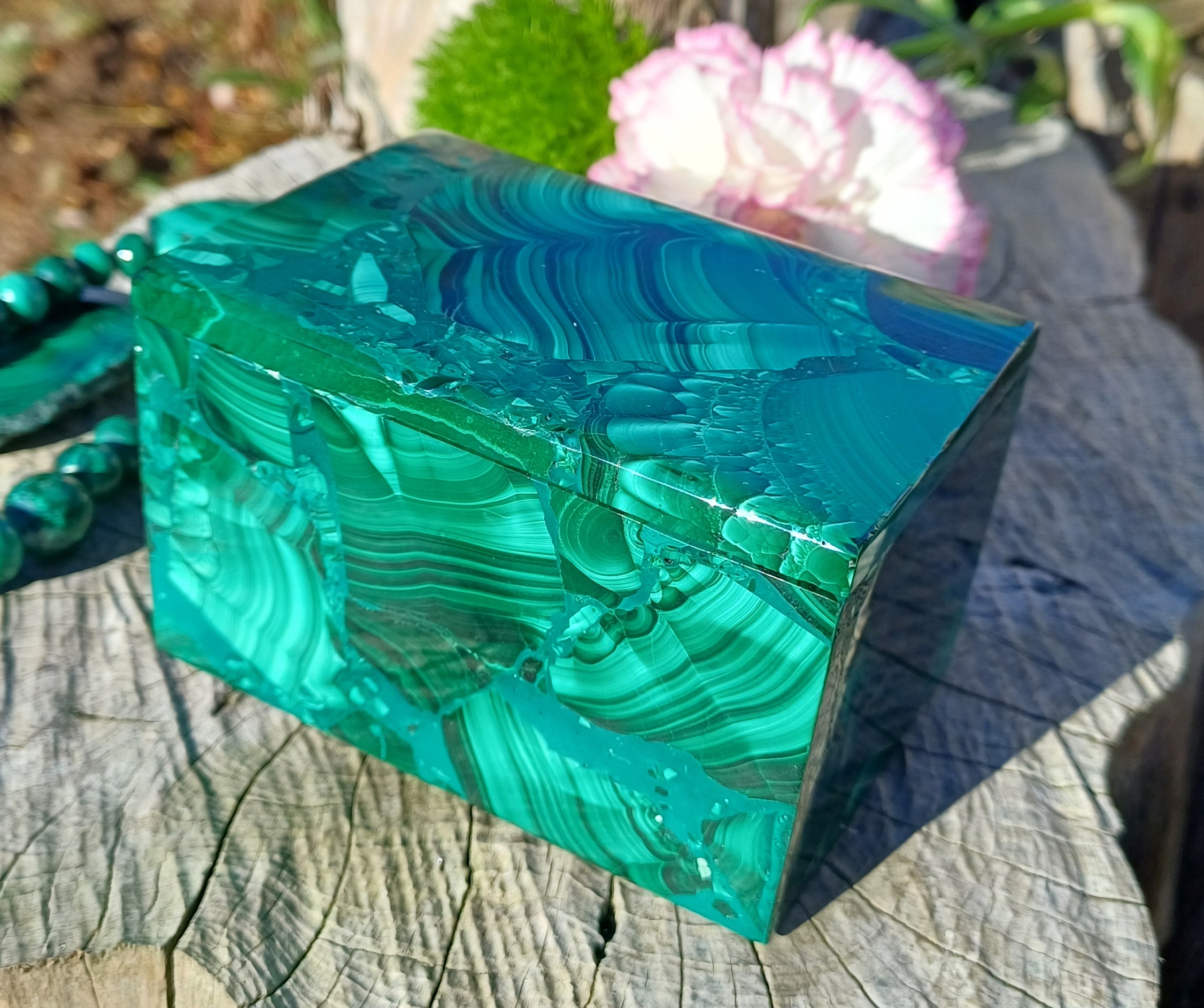 Ručně vyrobená krabička z malachitu, exkluzivní dárek, jedinečná kresba, šperkovnice.
