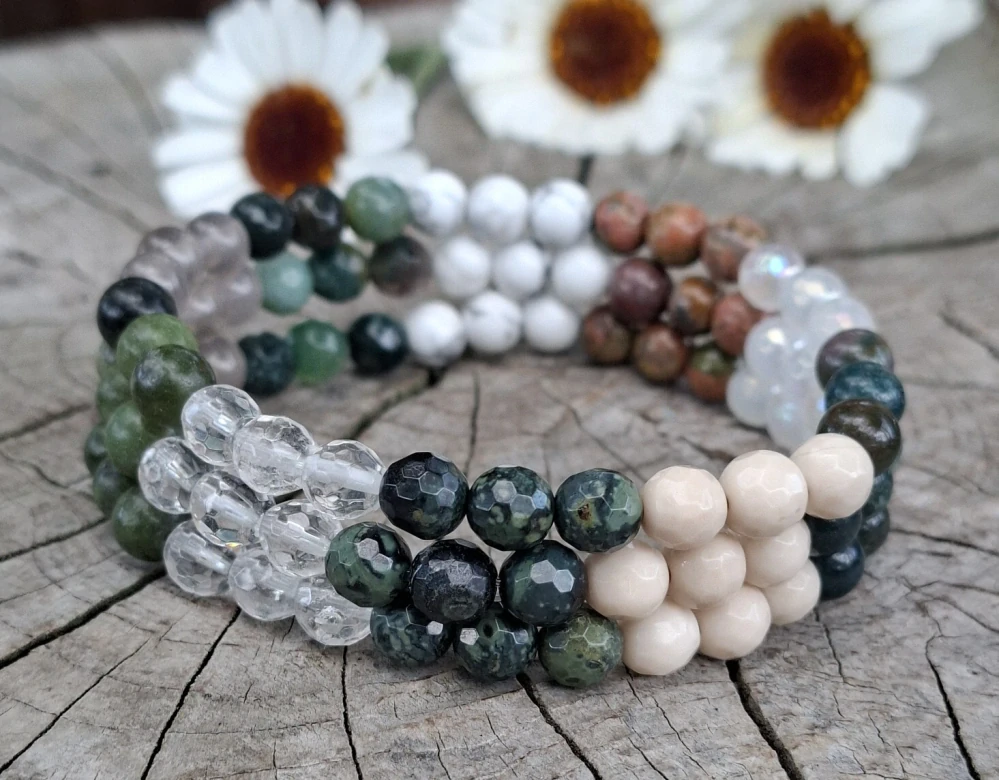 Náramek je vytvořen pro harmonizaci srdeční čakry v kompozici těchto minerálů: pokovený achát aura, unakit, magnezit, mechový achát, šedý achát, chryzotil, křišťál, jaspis kambaba, korál a heliotrop.