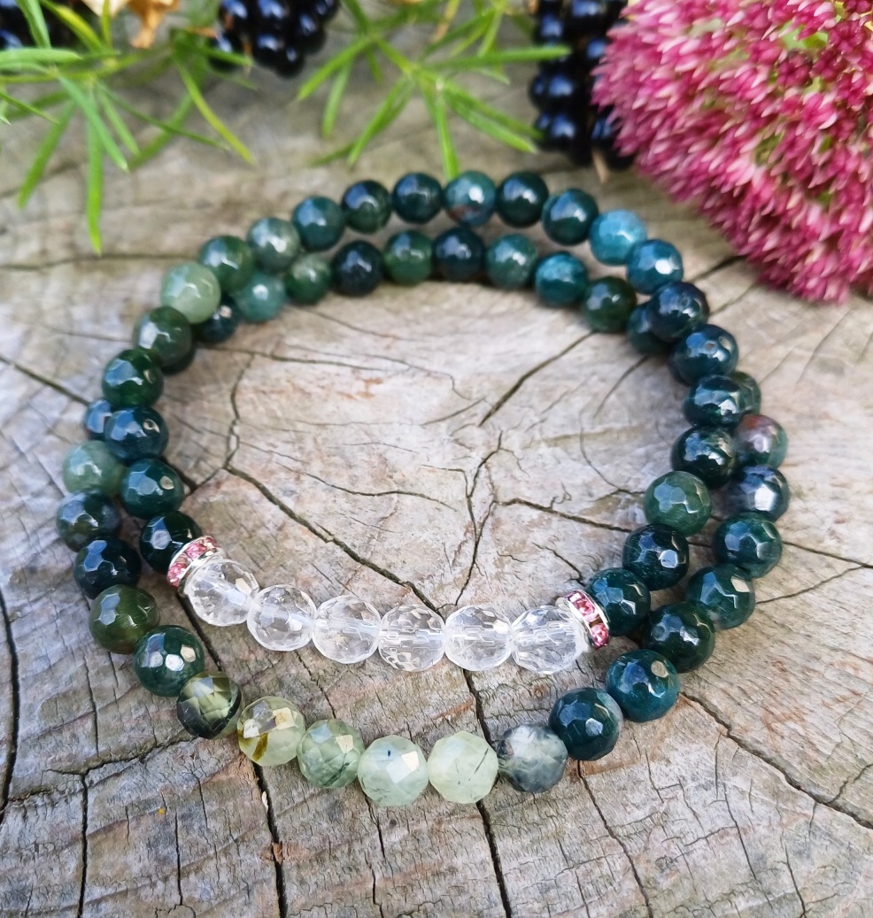 - Párové náramky mechový achát s křišťálem a prehnitem