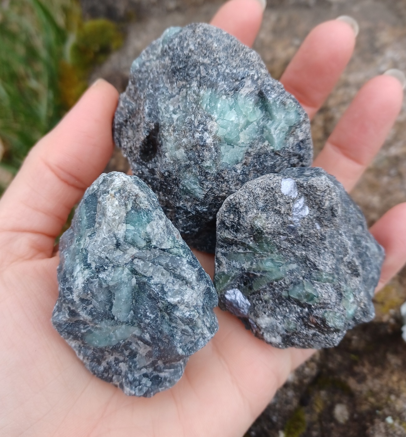 Krystaly smaragdu v hornině, náhodně vybraný surový kámen o velikost 3-5 cm a hmotnosti minimálně 35g.