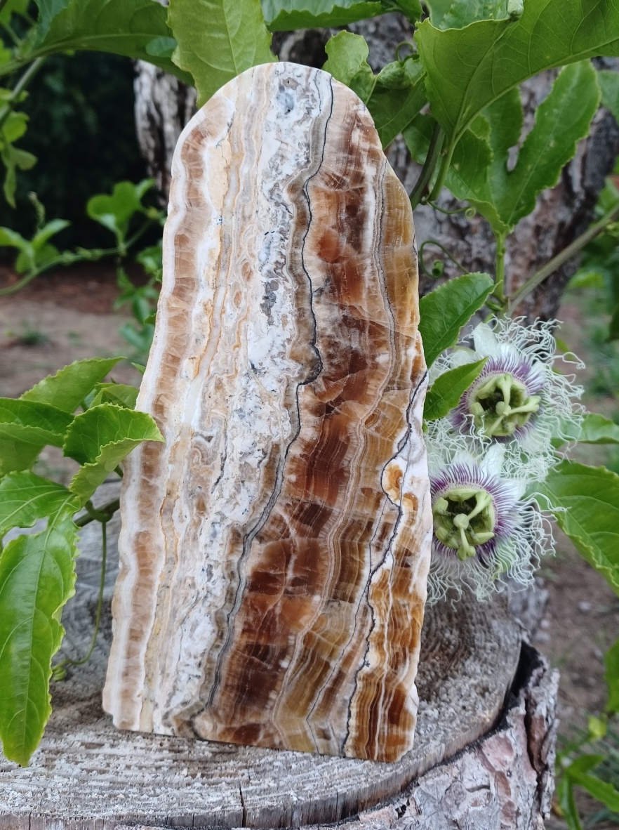 Těžítko z aragonitu s vřídlovcovou stavbou vyleštěno z jedné strany, řezaná základna.
