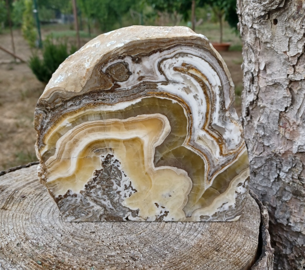 Těžítko z aragonitu s vřídlovcovou stavbou vyleštěno z jedné strany, řezaná základna.