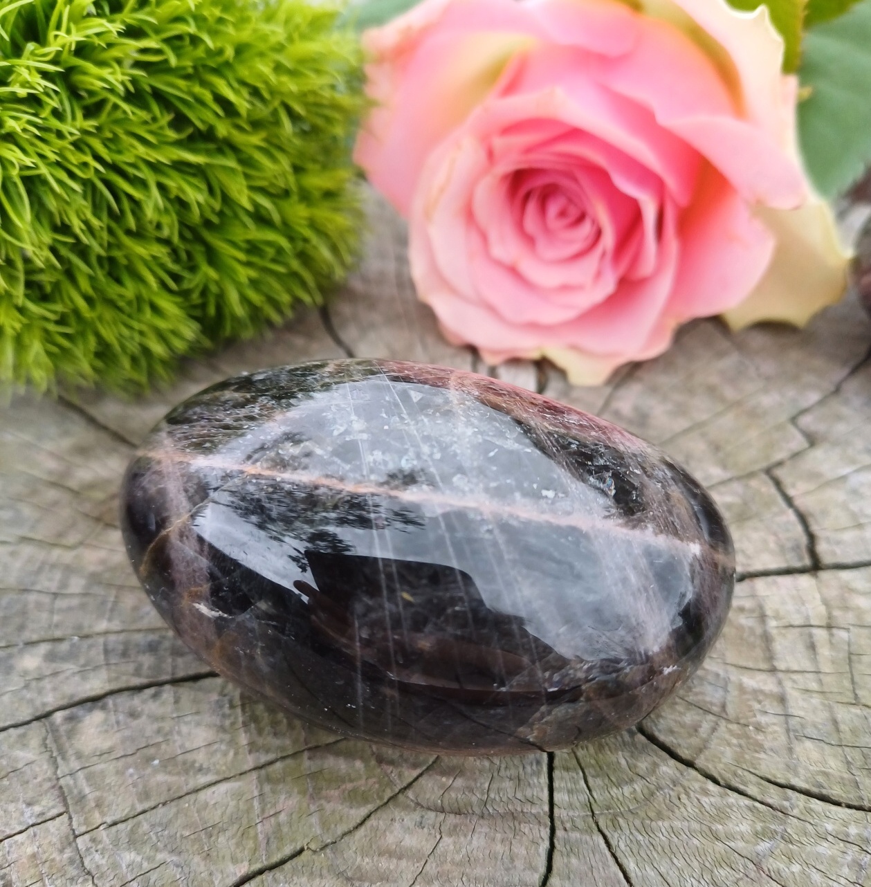 Neobvyklý černý měsíční kámen s optickým efektem.