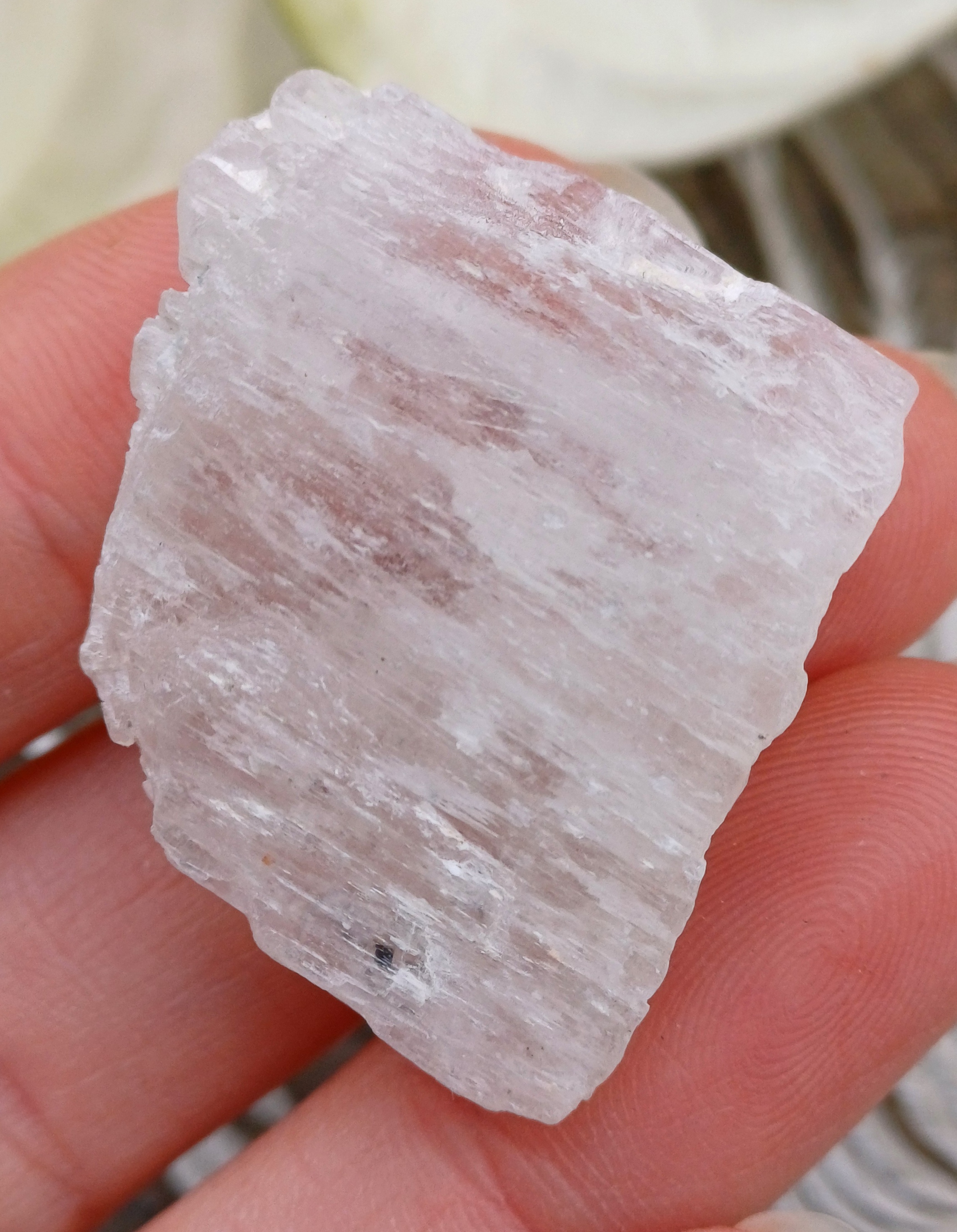 Vrtaný surový kunzit, díra v minerálu 3 mm.