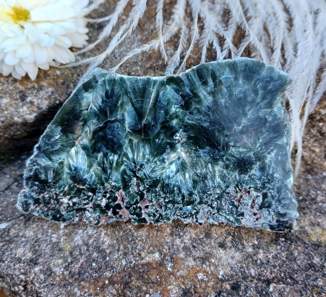 Leštěný plátek vzácného minerálu serafinitu s výraznou kresbou