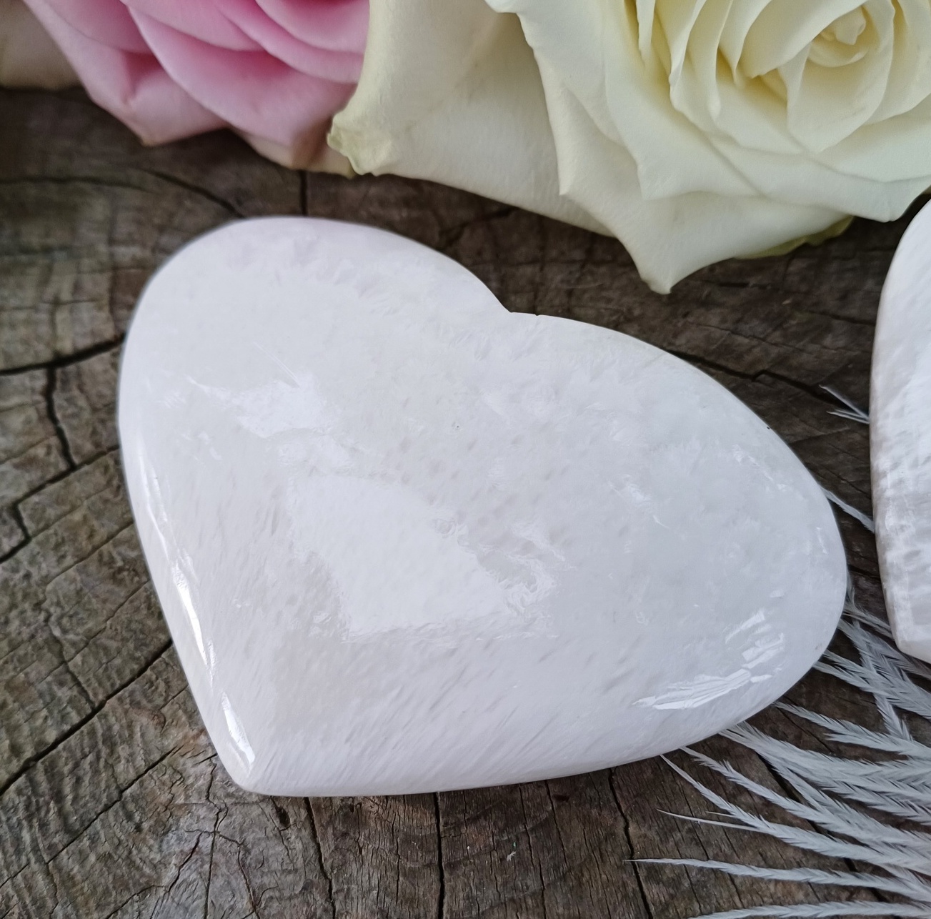 Srdíčko ze skolecitu s pěkným perleťovým leskem a radiálně paprsčitou kresbou