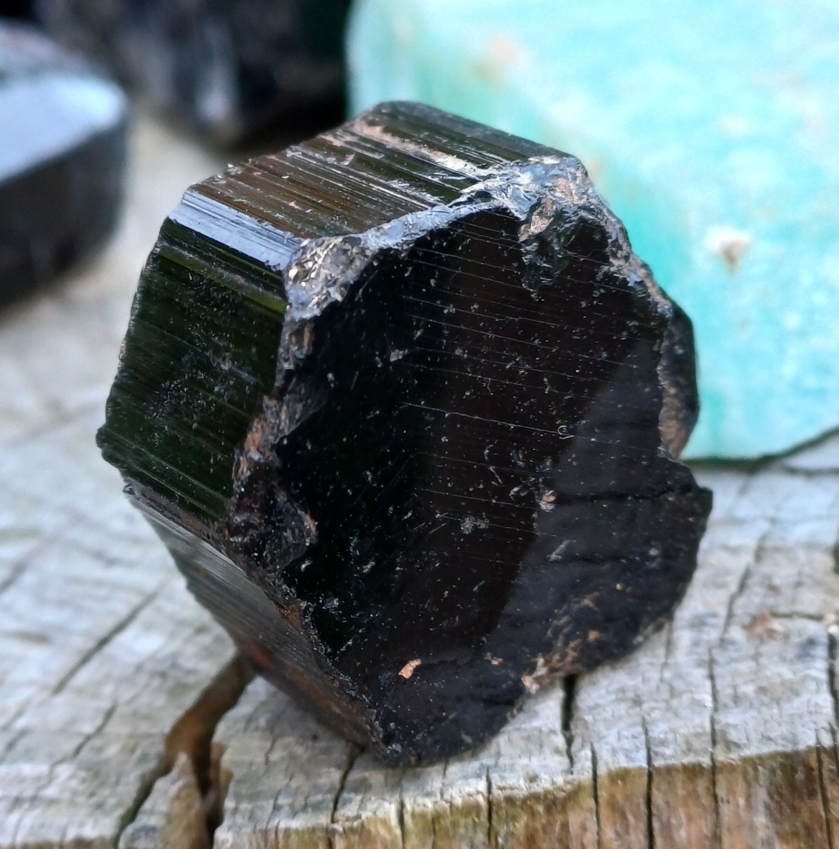 Krystal černého turmalínu s krásnými lesklými plochami a podélným rýhováním