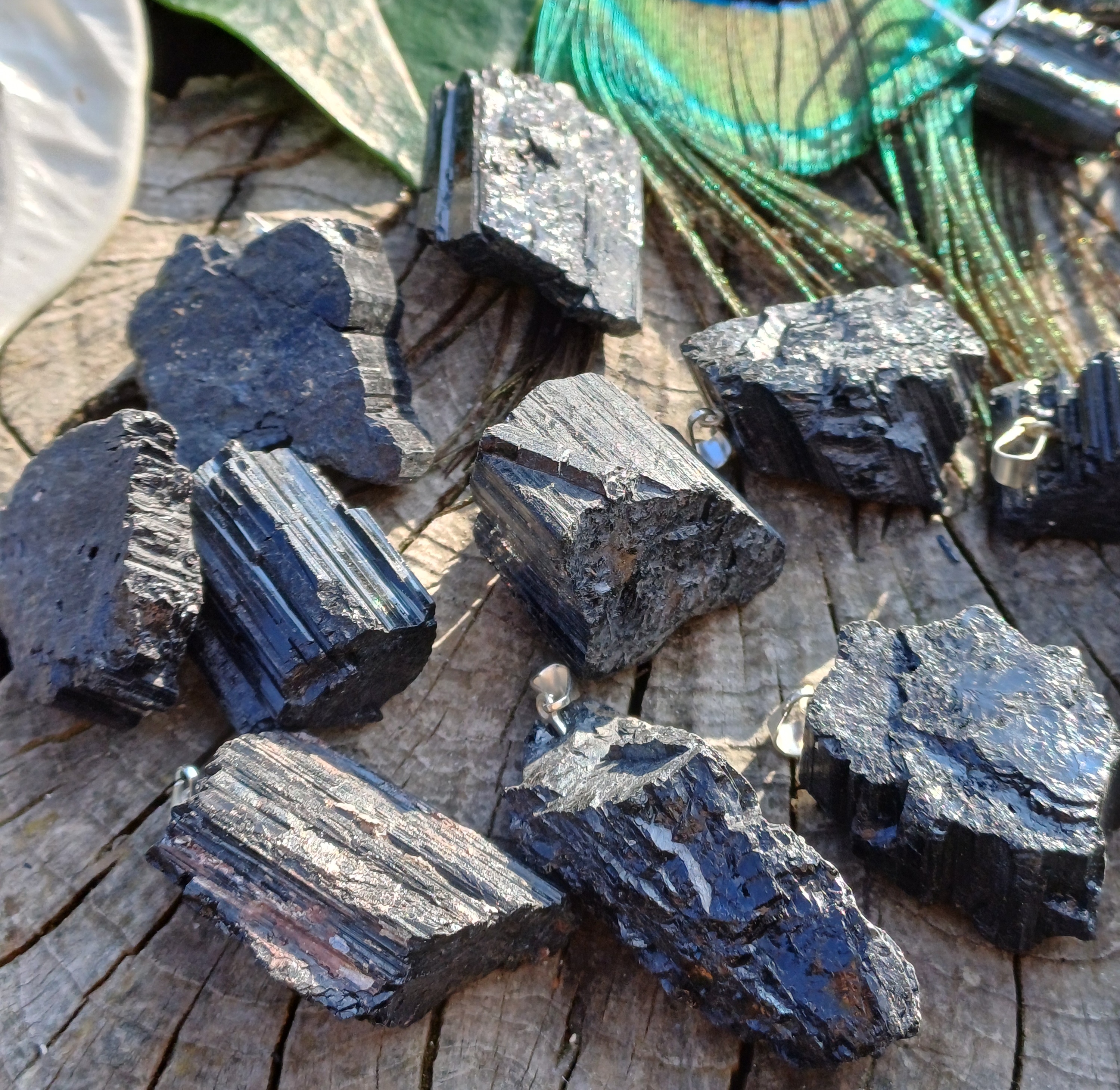 Přívěsek z krystalu černého turmalínu, stálobarevné bižuterní kovodíly bez obsahu alergenů.