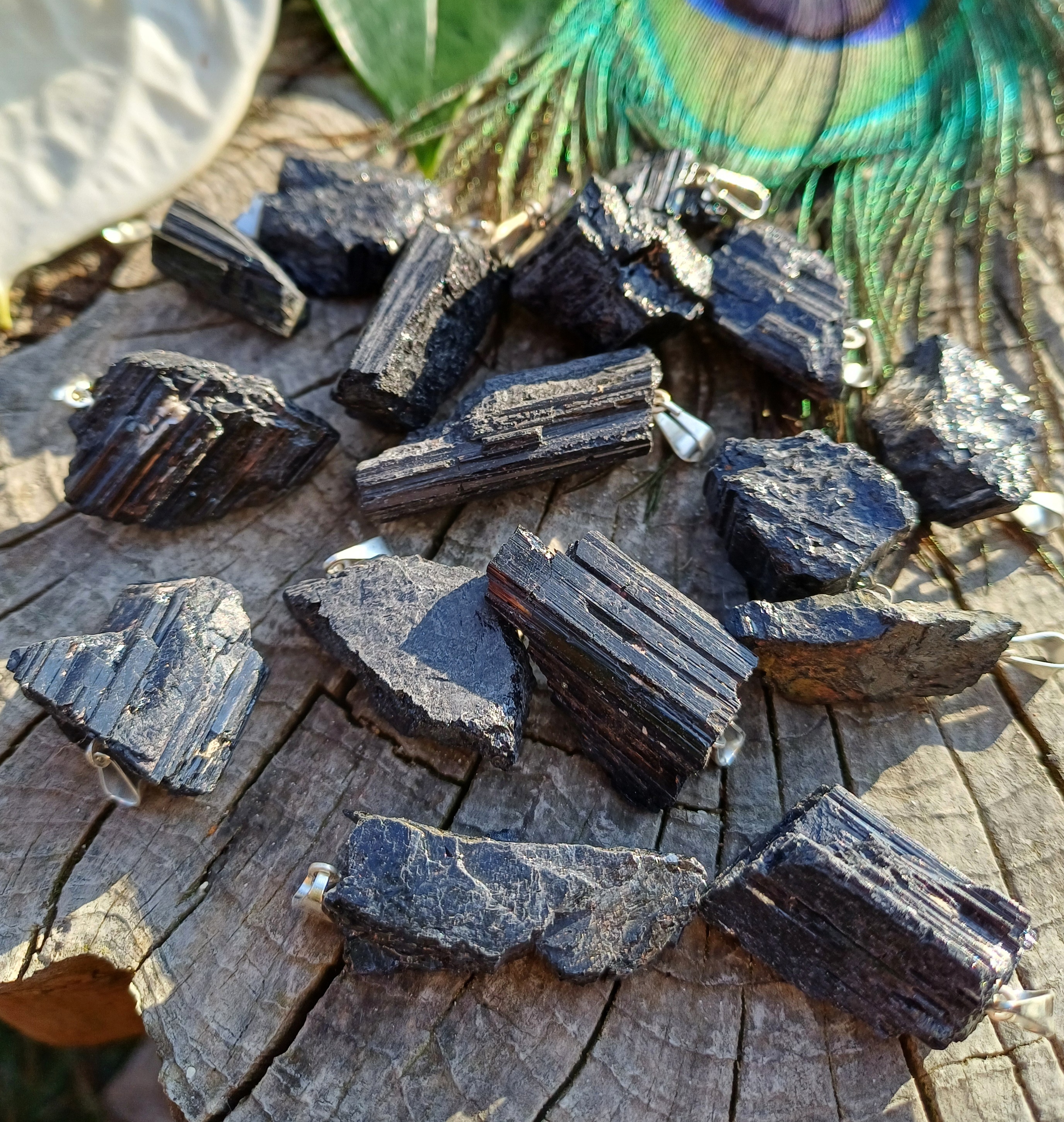 Přívěsek z krystalu černého turmalínu, stálobarevné bižuterní kovodíly bez obsahu alergenů.