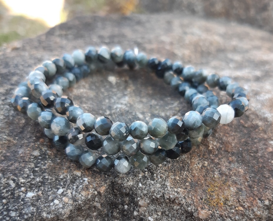 Orlí oko (někdy též křemenné kočičí oko) se od tygřího oka liší především barvou, tedy výrazně nižším obsahem železa. Obvod 18 cm, cena za 1 kus.
