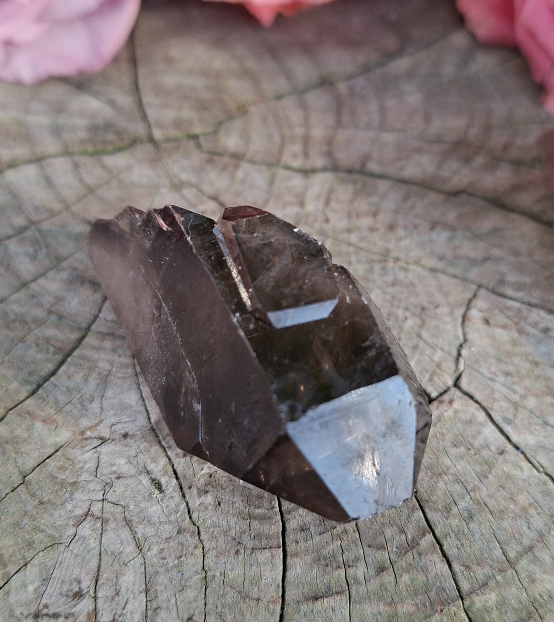 Oboustranně ukončený hrot přírodní záhnědy s viditelným tmavším oknem. Záhněda získává své charakteristické tmavé zbarvení vlivem přírodní radiace, která způsobuje změny v elektronovém uspořádání atomů, a tím i rozdílnou sytost barvy v jednom krystalu.